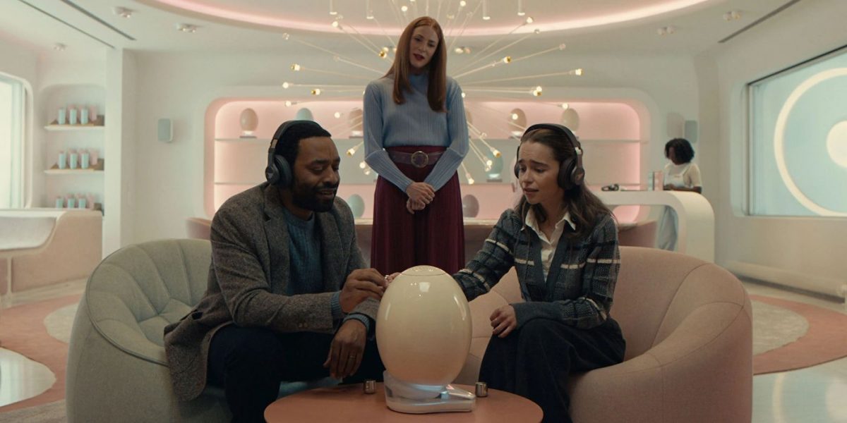 In The Pod Generation, written and directed by Sophie Barnes, Rachel (Emilia Clarke) and Alvy (Chiwetel Ejiofor) are a couple that at one point find themselves debating the pros and cons of natural childbirth versus having a baby in a pod. A burgeoning technology near the end of the 21st century has made it so that more well-to-do individuals can have the entire birth process take place in an external pod. Alvy, a botanist who embraces the old way of nature that the rest of the world has seemingly forgotten, wants to go with natural childbirth, whereas Rachel, who has just been promoted at her tech company, has embraced the idea of the pod.