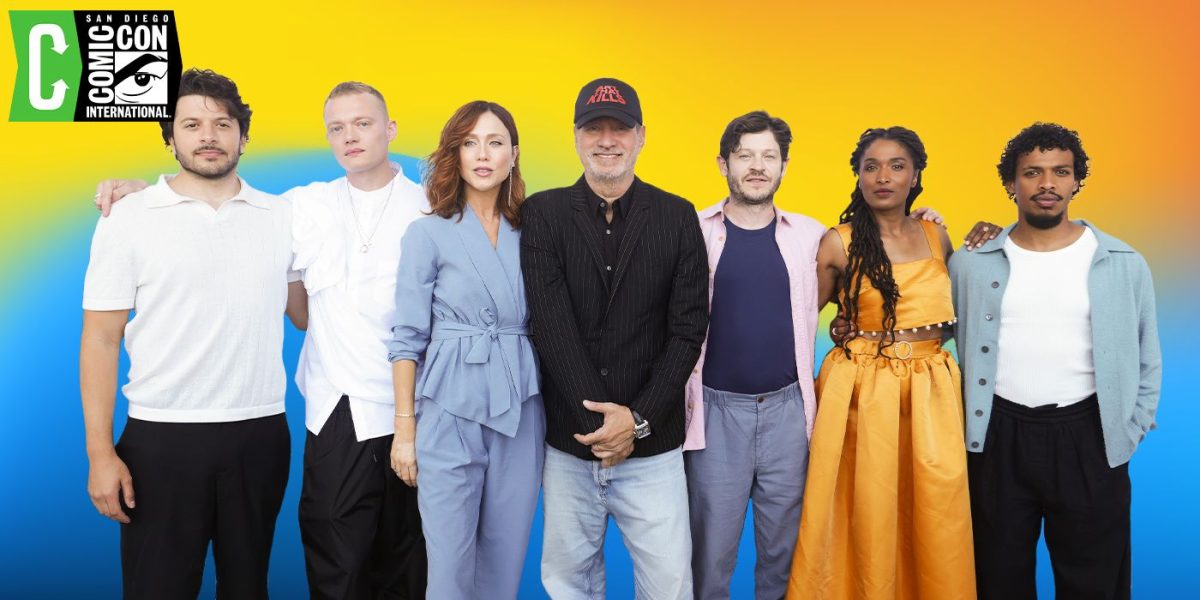 with Roland Emmerich and stars Iwan Rheon, Jojo Macari, Sara Martins, Moe Hashim, Dimitri Leonidas, and Gabriella Pession at San Diego Comic-Con 2024.